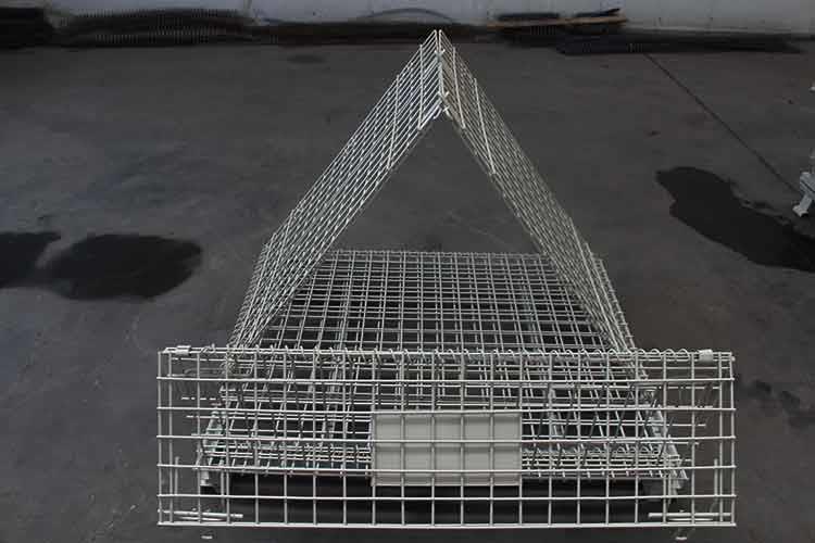移动式美固笼外形轻巧,笼体除底框外都有铁丝碰焊成的网片组合而成;网片与网片、网片与底框靠小连接件连接,可活动。且前后面可打开,在堆垛后能取物,堆垛时承重在侧面的网片上。该移动式美固笼已完全具备可堆垛性、可折叠性及可搬运性,日益成为物流流通的一种重要物流容器。